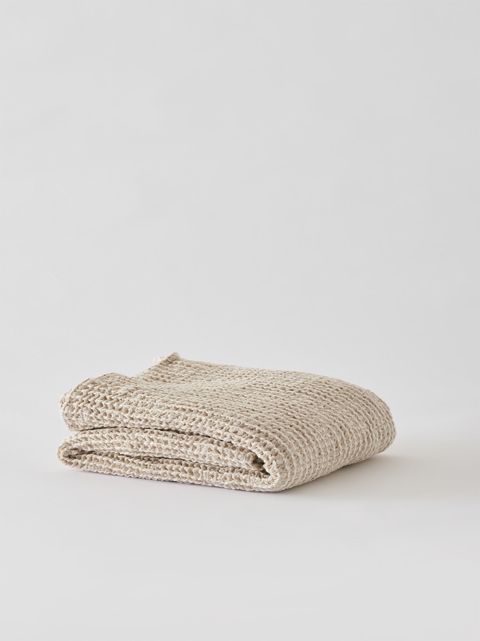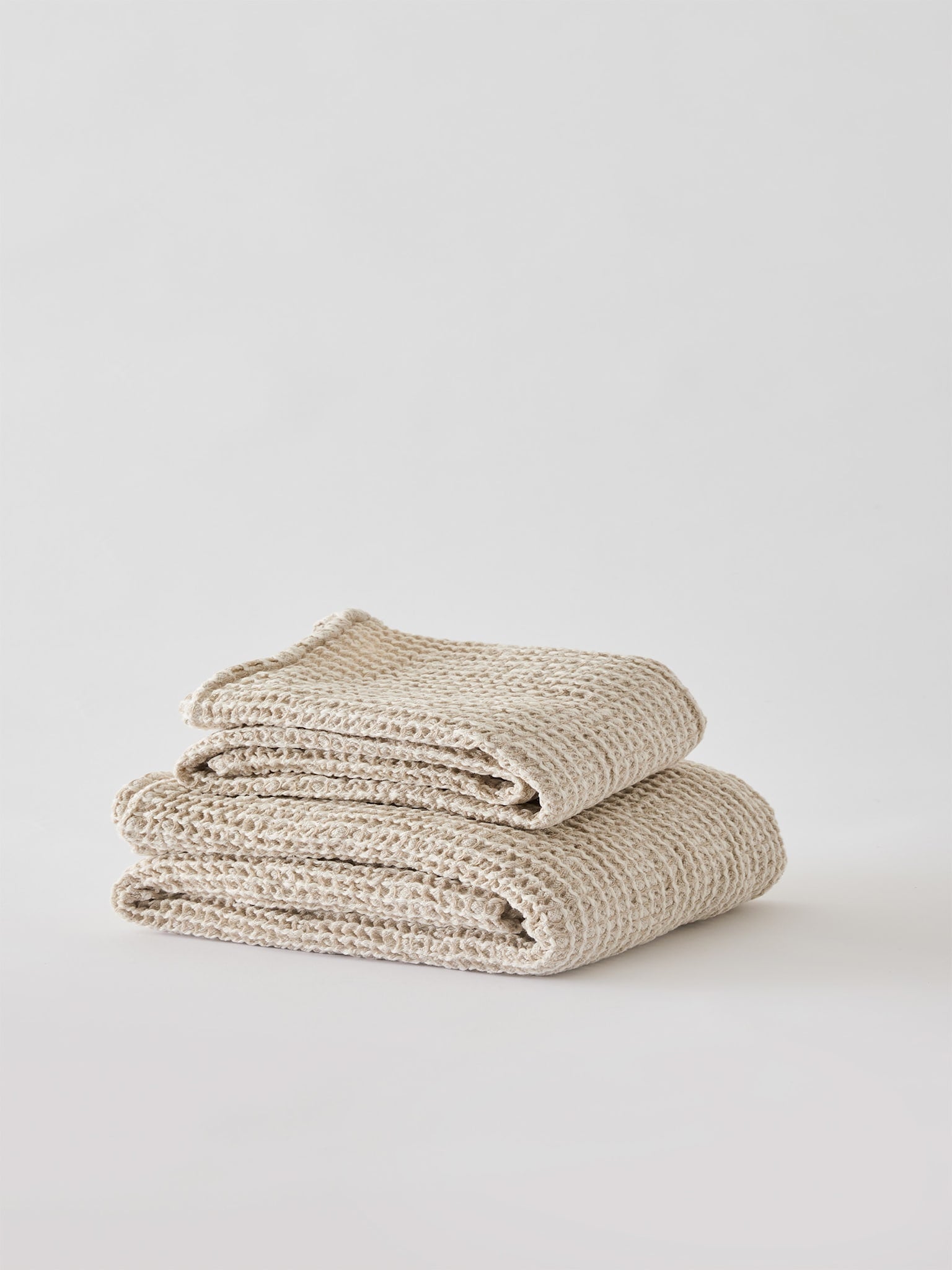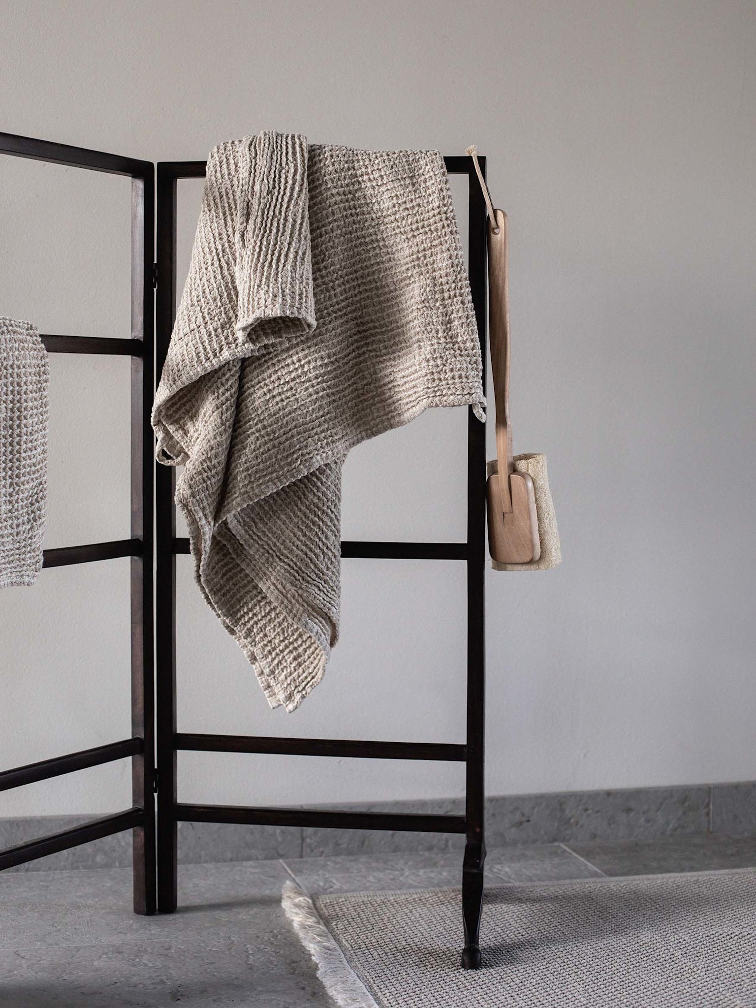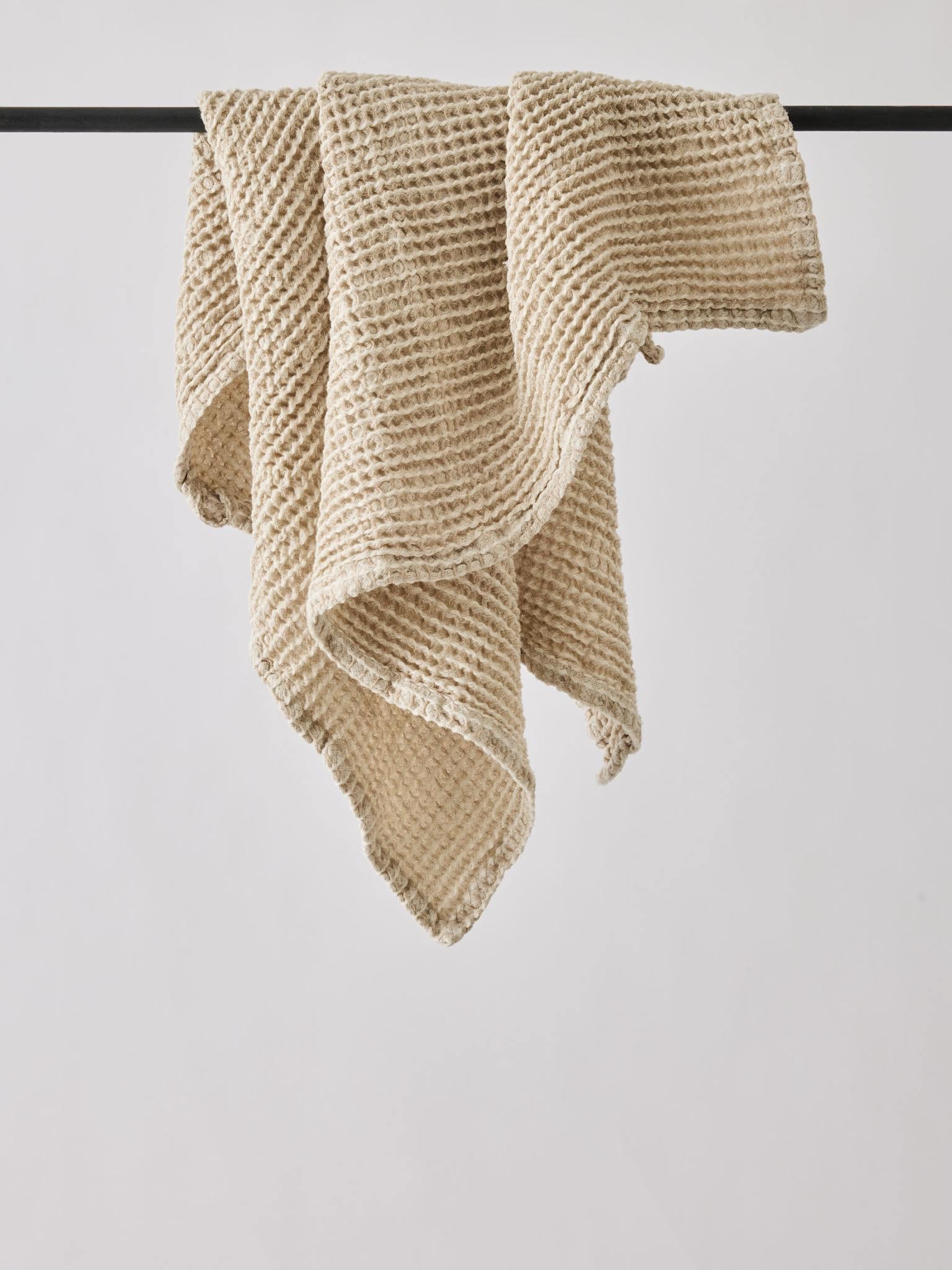 A soft and airy towel in a blend of cotton and linen with a waffle structure. The towel is both absorbent and quick-drying thanks to the natural properties of linen and the softness of cotton. The neutral beige color makes the towel fit into any bathroom. Available in two sizes: 50x70 cm and 70x140 cm.