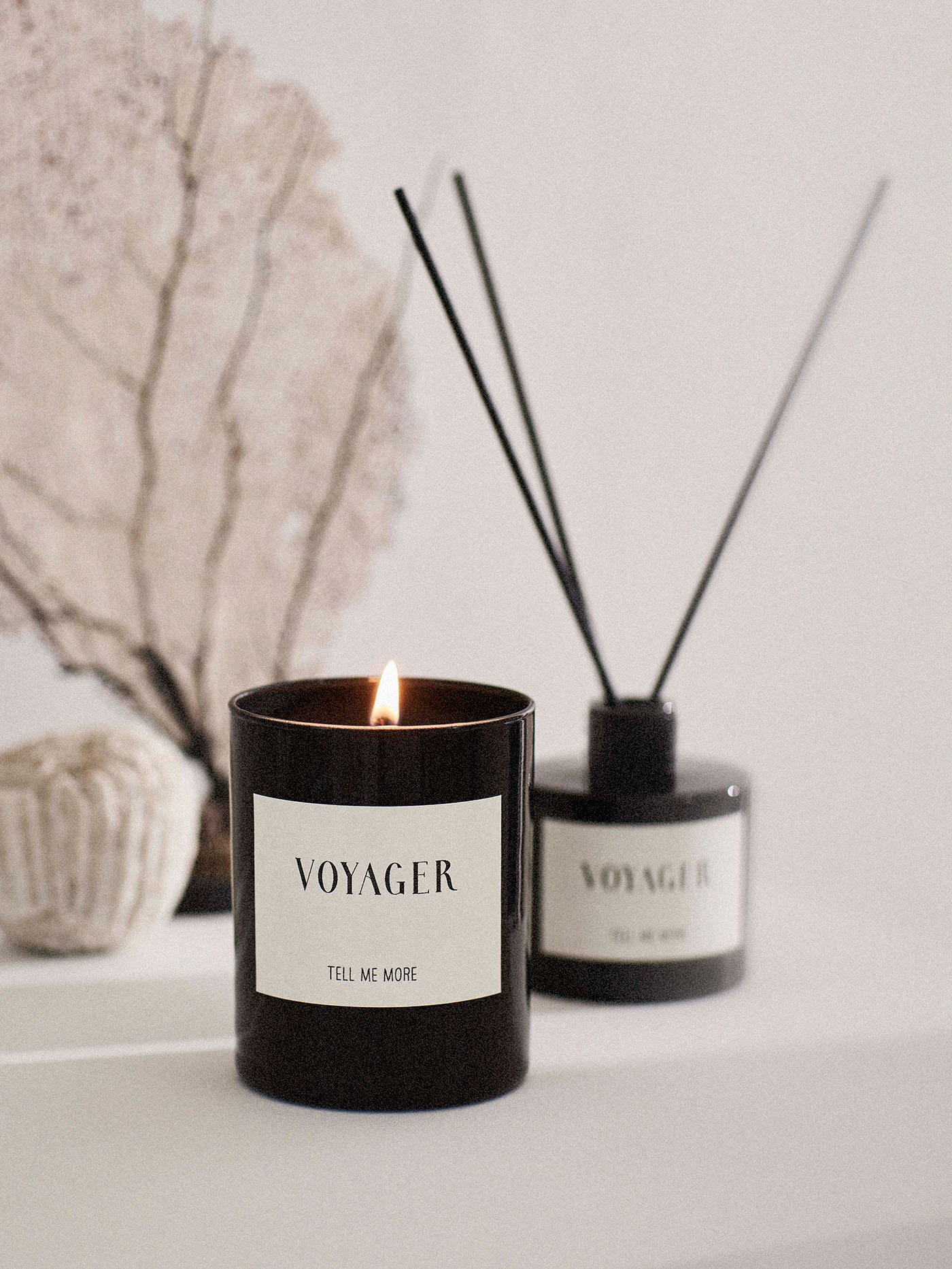 Scented sticks in the scents Nomad and Voyager. The scented candle containers are made of dark glass and are designed to be a beautiful interior detail. Feel free to reuse the container after the candle has burned down.