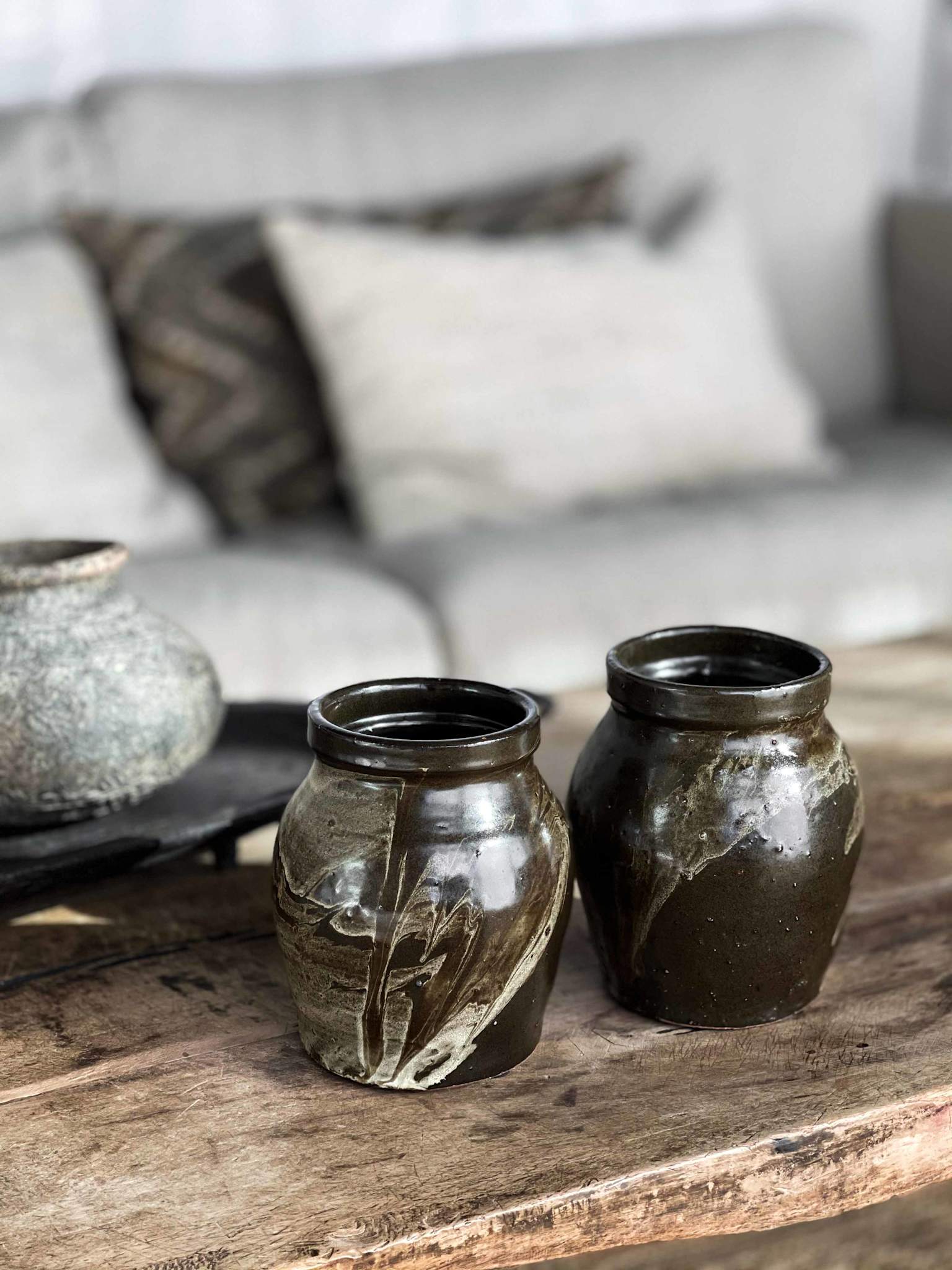 Decorative pot/urn in earthenware that is hand-turned. The pot has a burnt dark brown tone with beautiful variations in the glaze. Each pot is hand-turned and glazed, which makes each product unique, color and shape may therefore differ from pictures. The inside of the pot is treated with wax to withstand some moisture. When used as a vase, it is recommended to place a glass or other protection inside against prolonged contact with water. Our Franca pot is also excellent for storing utensils in the kitchen.