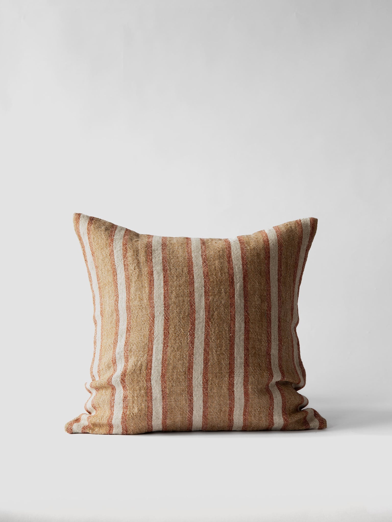 Timeless cushion cover 50x50 in coarse linen. Maurice cushion cover has a beautiful structure with brown, beige and white stripes. The cushion cover fits perfectly with both the sofa and the bed and can be mixed with other beautiful decorative cushions. The cushion cover has a vibrant color tone with different variations and shades in the fabric. The fabric used is handwoven, which makes each cushion cover unique and the texture, color and shape may therefore differ slightly from the pictures. The cushion cover closes with a discreet zipper at the bottom and comes without an inner cushion. Inner cushion 50x50cm is sold separately.