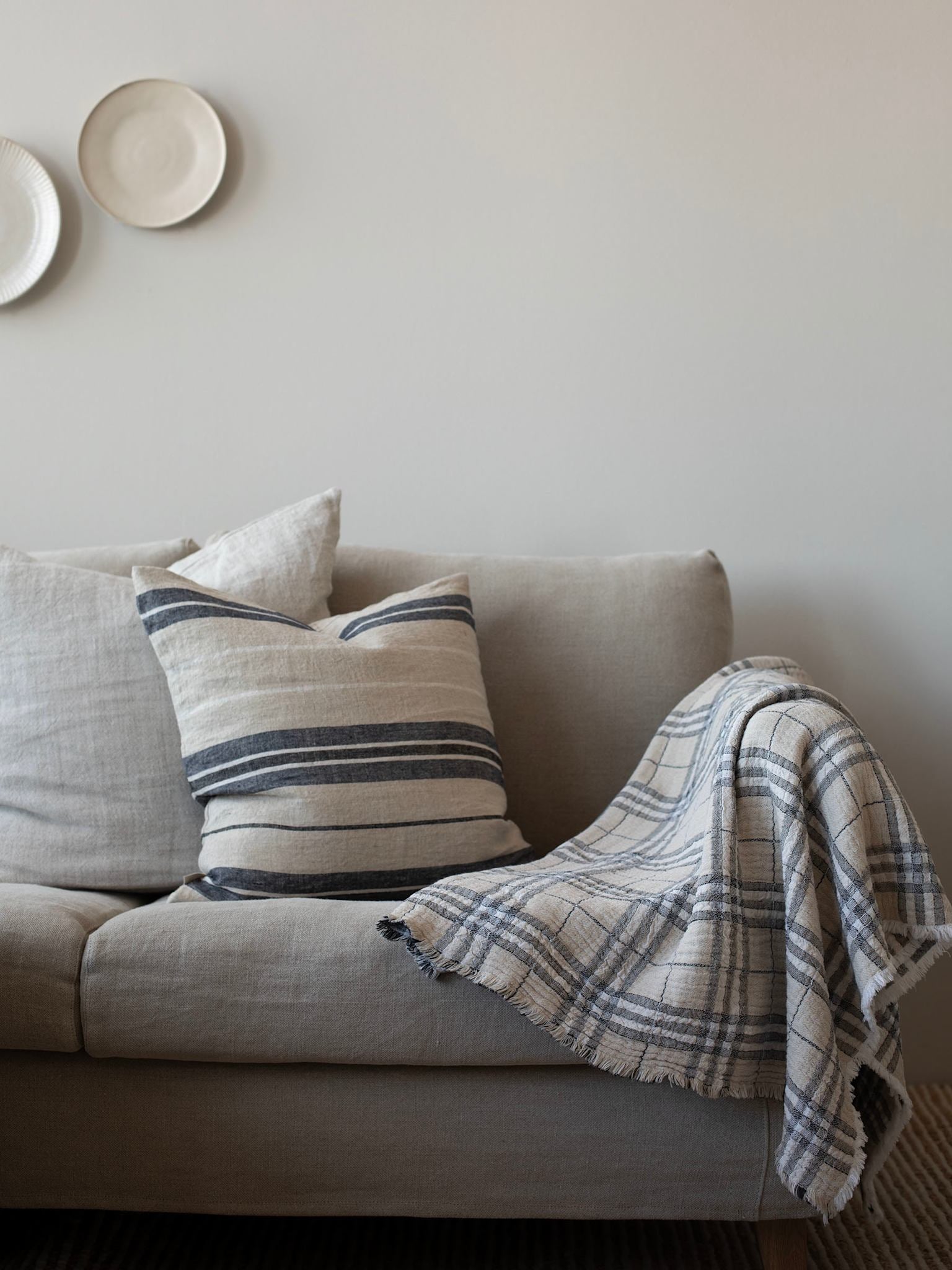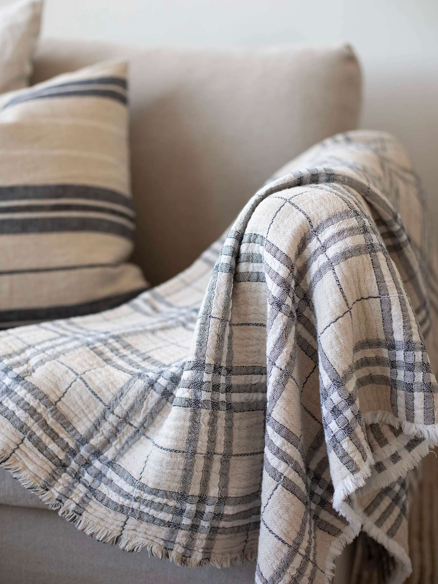 Milton is a heavier throw in stonewashed cotton. It has a beautiful heavy drape. The throw has a woven checkered pattern in the colors beige, white and dark gray. The short side of the throw is finished with fringe. Milton works just as well to wrap yourself in during late summer evenings as it does as a beautiful detail on the sofa.
