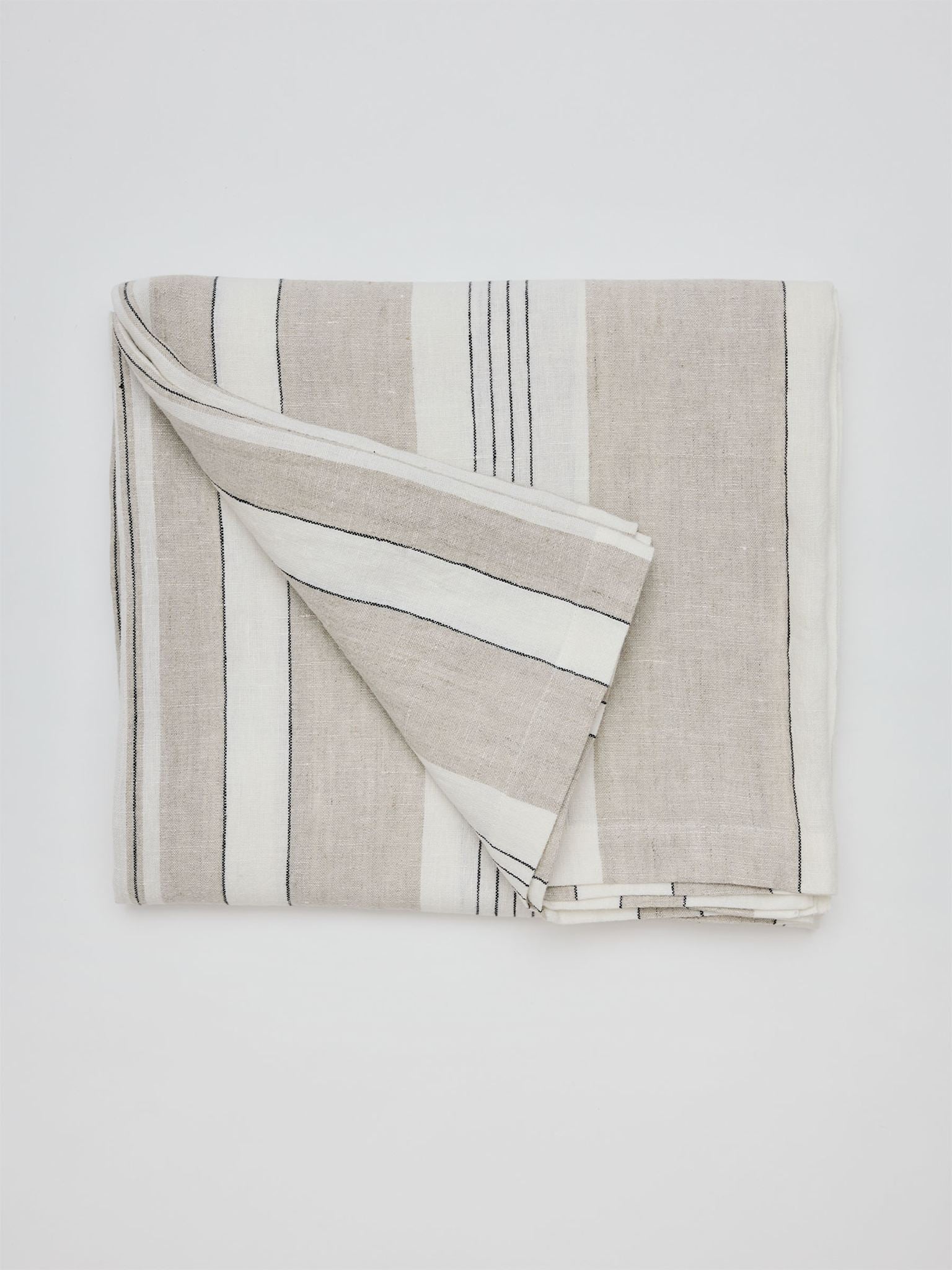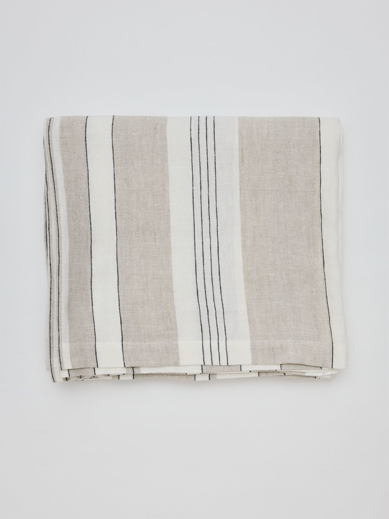 Noah is a beautiful linen tablecloth with a white base, wide beige stripes and narrow black details. The tablecloth is woven in one piece, where the slats along the long sides contain a small amount of cotton for extra stability. With a weight of 180 gsm, the tablecloth has a light and supple quality that makes it easy to set the table, while maintaining the natural feel and structure of the linen. Noah is available in two sizes: 145x270 cm and 145x330 cm.