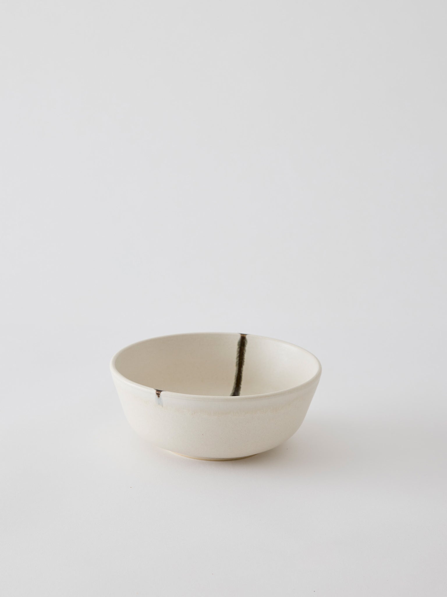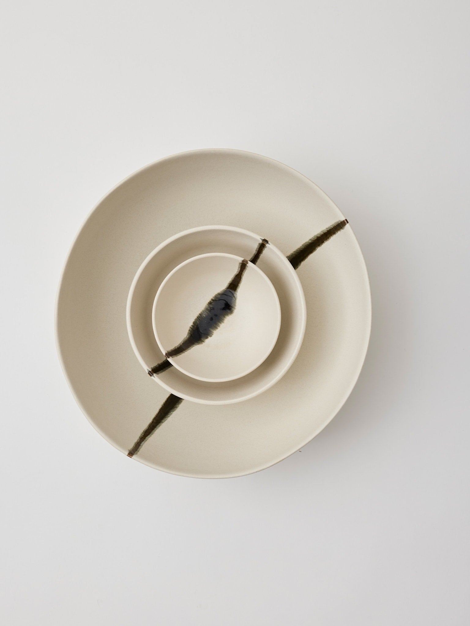 Handmade serving bowl in a white color with a green/black burnt line that gives a nice pattern in the stoneware. The bowl is perfect for serving sauces, snacks or other accessories. The Toledo series also includes a slightly smaller bowl, a salad bowl, and a matching assiette. Toledo looks great with our stoneware series Centro in the color wheat or our new series Granada.