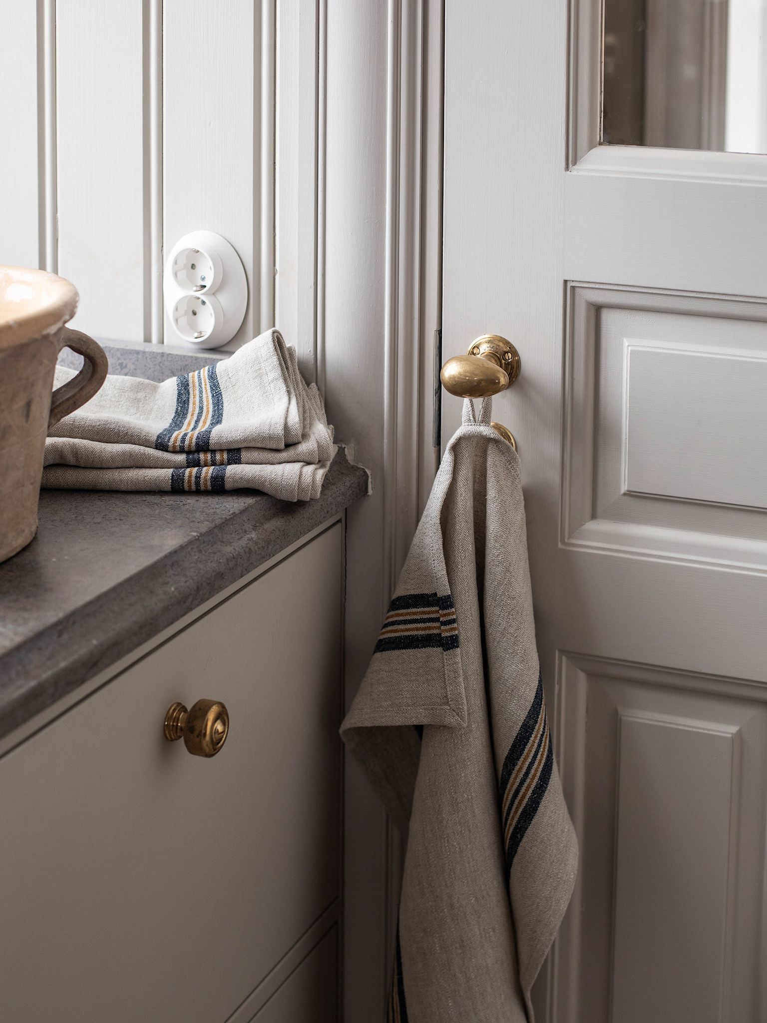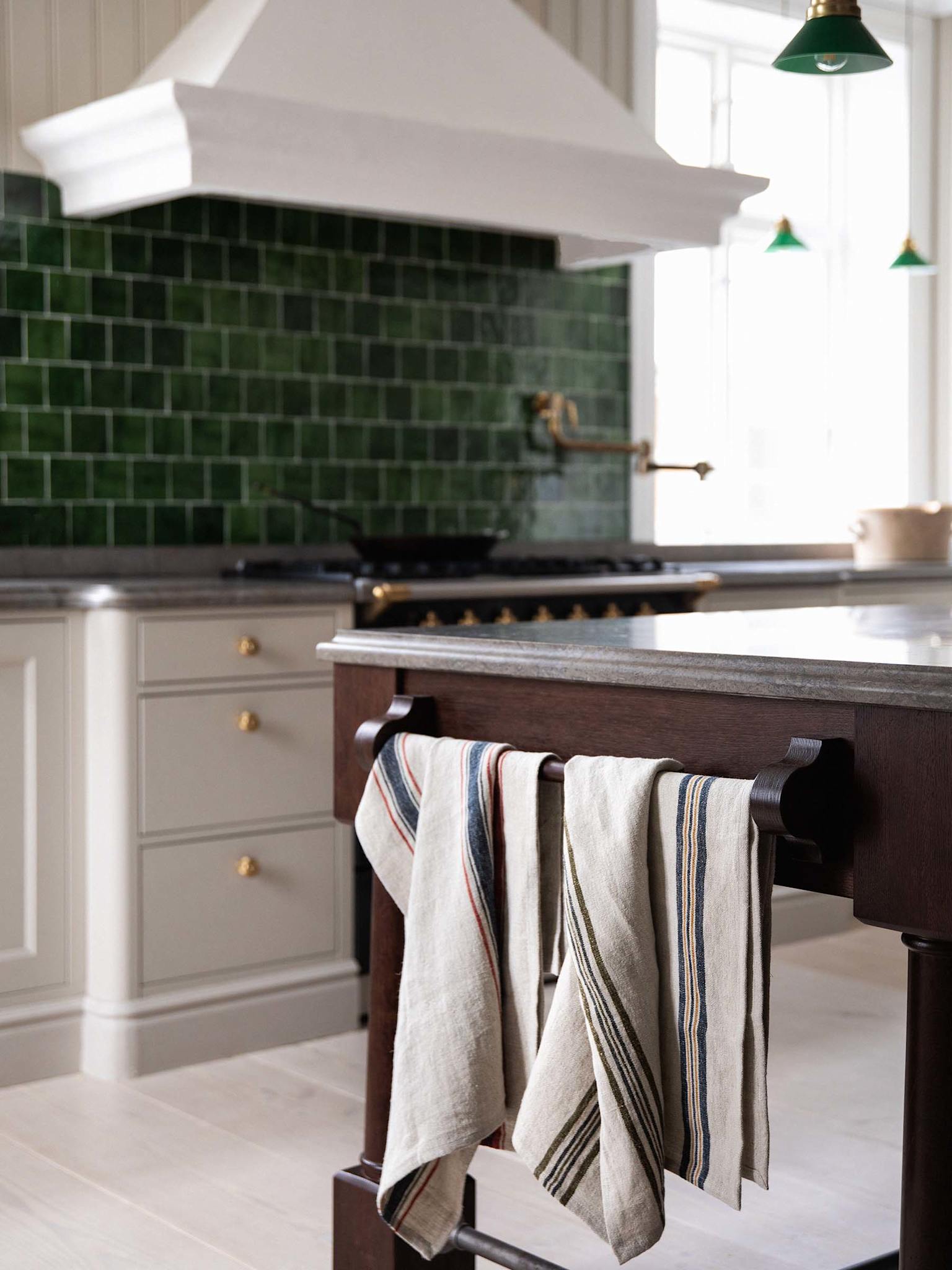 Kökshandduk i 100% europeiskt linne. Linnehandduken Astrid är i en grövre linnekvalitet och har en vacker struktur med ränder i olika storlekar. Tyget har en vacker levande färgton med olika skiftningar som ger ett tidlöst intryck och kommer leva säsong efter säsong. Handduken har fantastiska egenskaper som passar utmärkt för kökstextilier, bland annat har den en hög absorptionsförmåga, torkar snabbt, är slitstark och håller över tid. Handduken är försedd med en ögla i ena hörnet. I textilserien Astrid hittar ni servetter och kökshanddukar som finns i färgerna Mustard, Navy, Olive och Red.