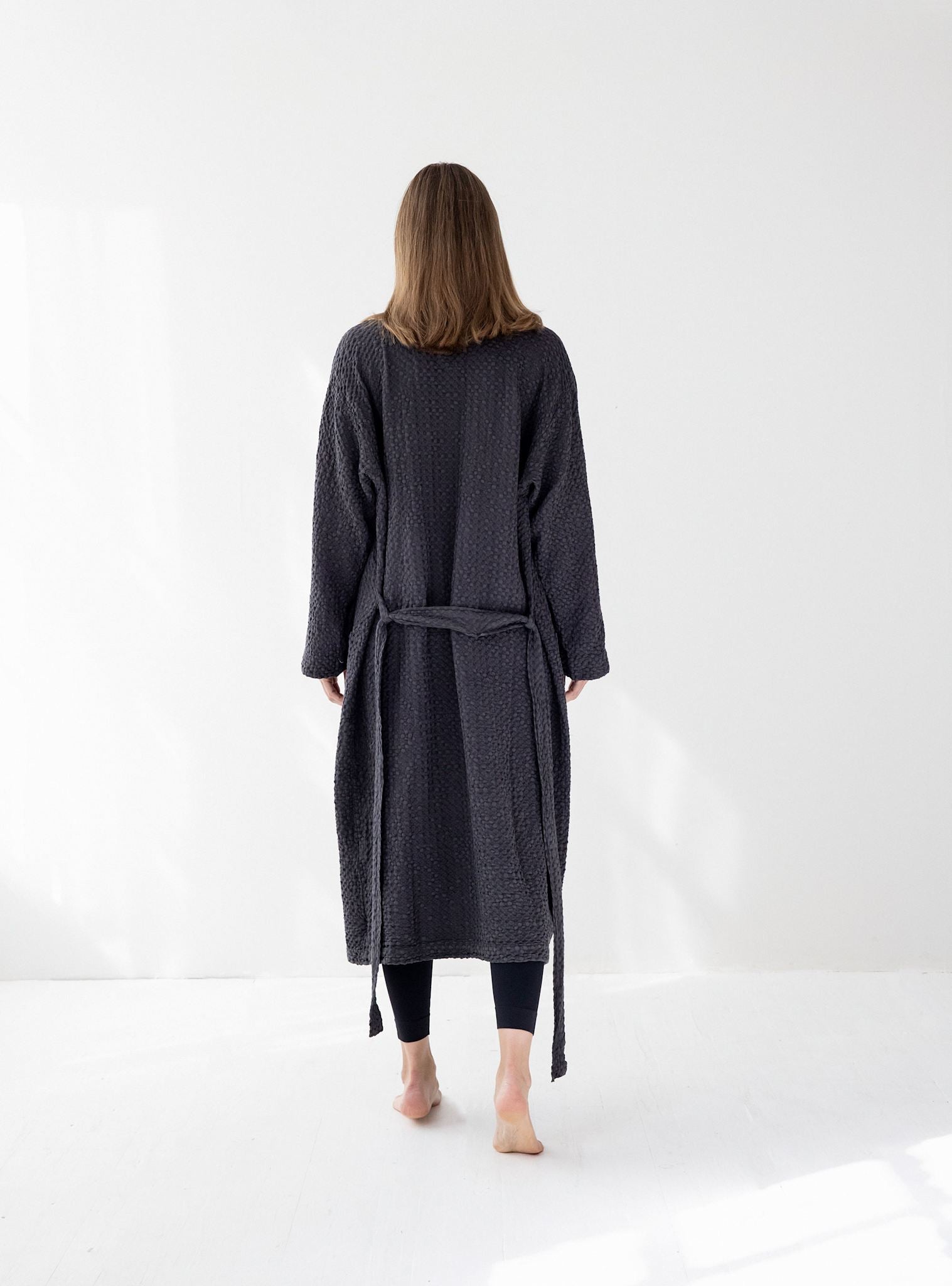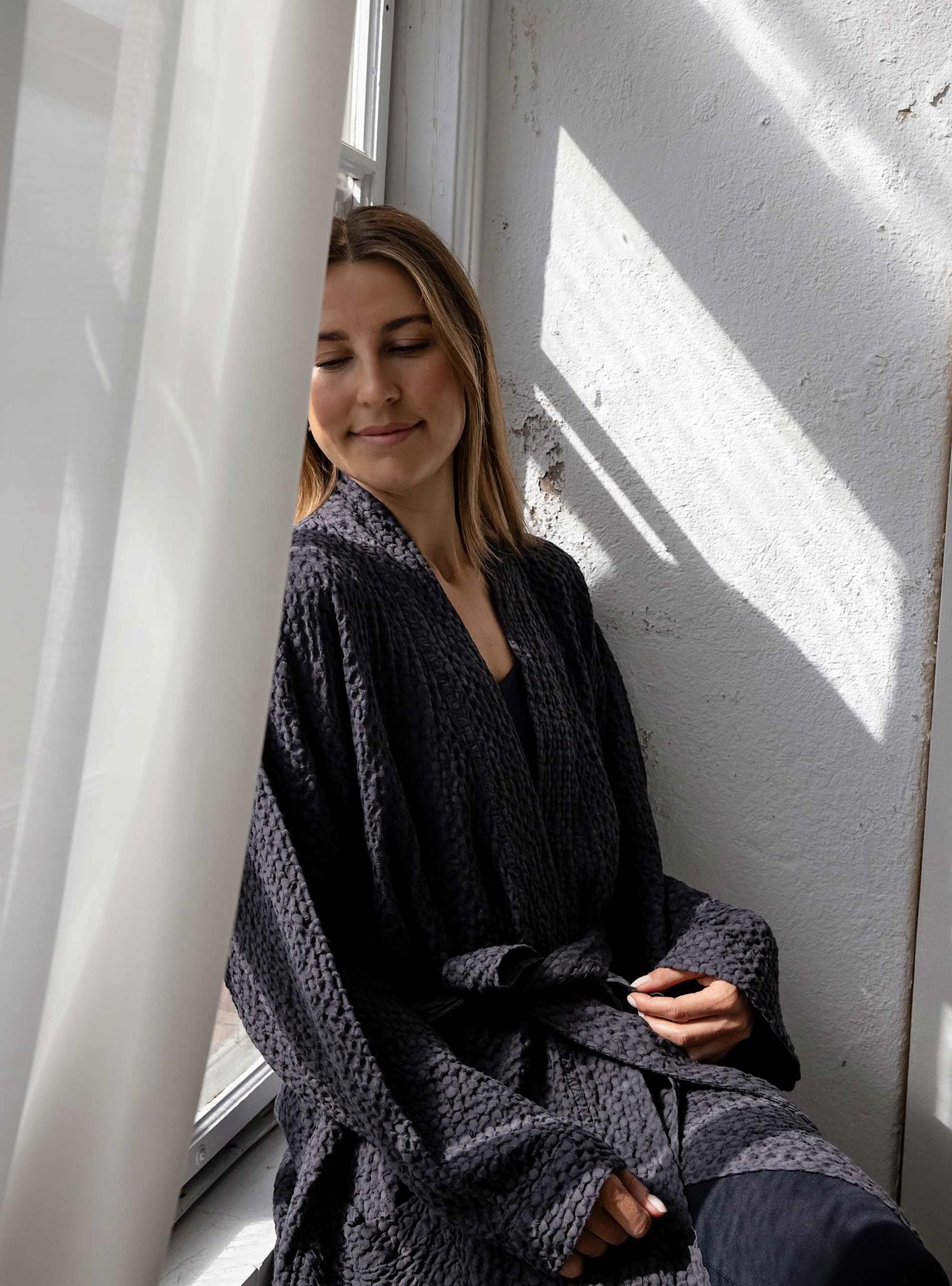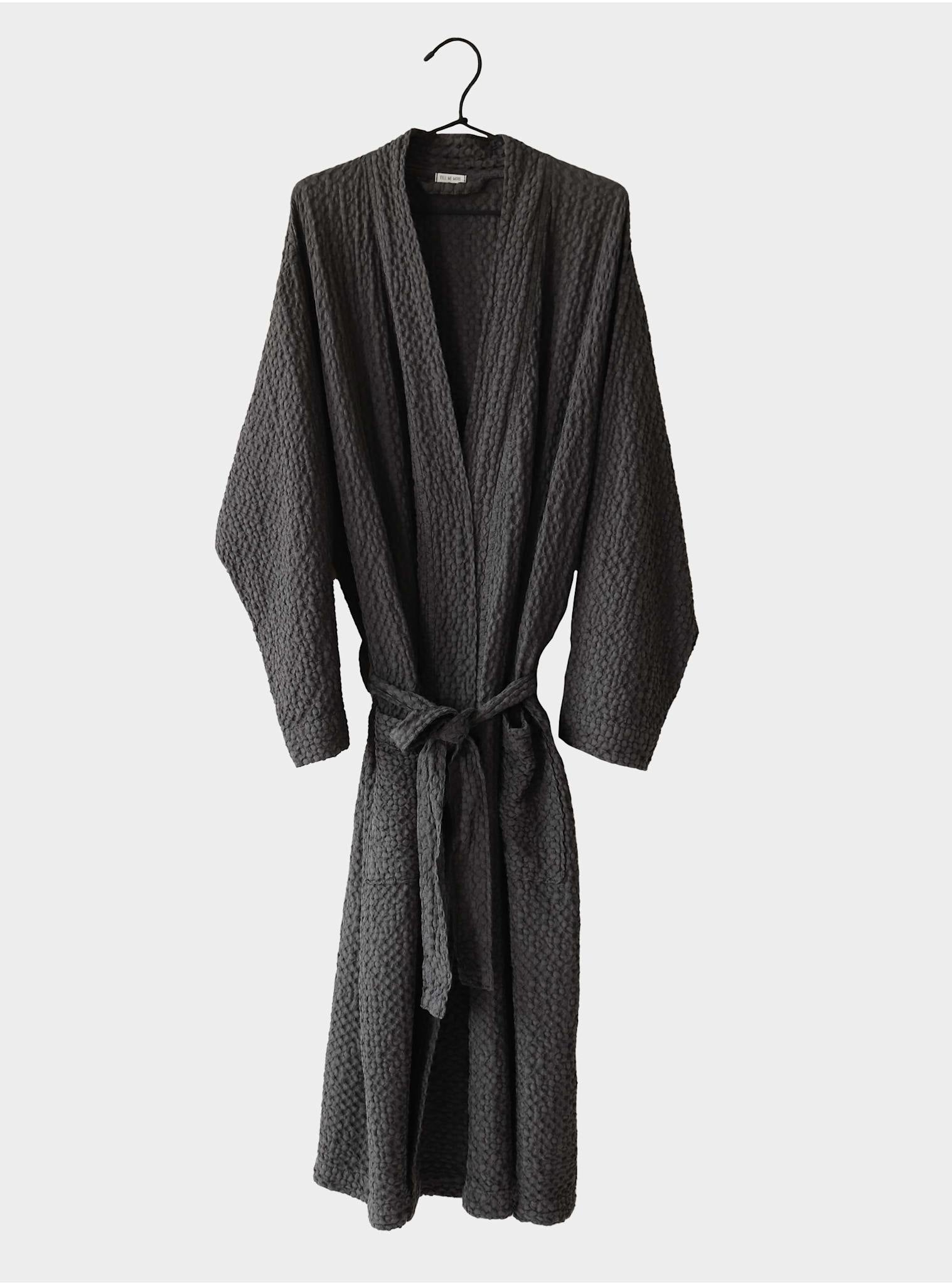 Santo är vår vackra badrock i våffelvävd bomull. Det mjuka och sköna materialet gör att du får en underbar känsla redan från första stund. Santo har en sober design med två påsydda fickor fram och ett avtagbart knytskärp i matchande design. Morgonrocken är unisex och finns i storlekarna S/M och L/XL. Santo är tillgänglig i två dova och vackra färger, Charcoal och Sand beige.